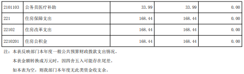 (3)卫生健康支出(类)行政事业单位医疗(款)公务员医疗补助(项)33.99万元,主要是公务员医疗补助等支出,完成年初预算的0%,决算数与年初预算数存在差异的主要原因是科目调整,无年初预算。