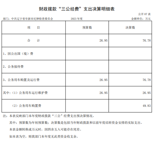 2023年度财政拨款安排的“三公”经费支出76.78万元,完成预算的284.90%,决算数大于预算数的主要原因是更新执法执勤车辆2台。其中:因公出国(境)费0.00万元,公务接待费0.00万元,公务用车购置及运行维护费76.78万元。